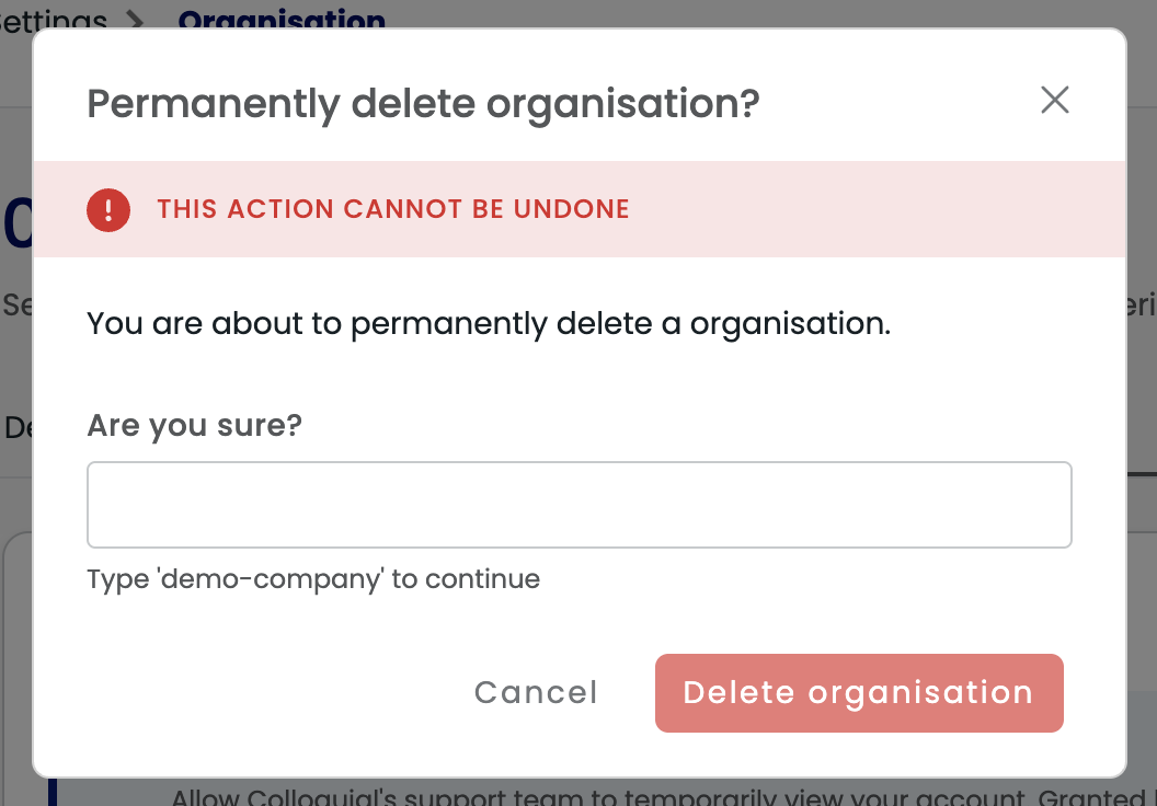 You will be signed out and redirected to the Colloquial website. Your organisation and all its data has been permanently removed.