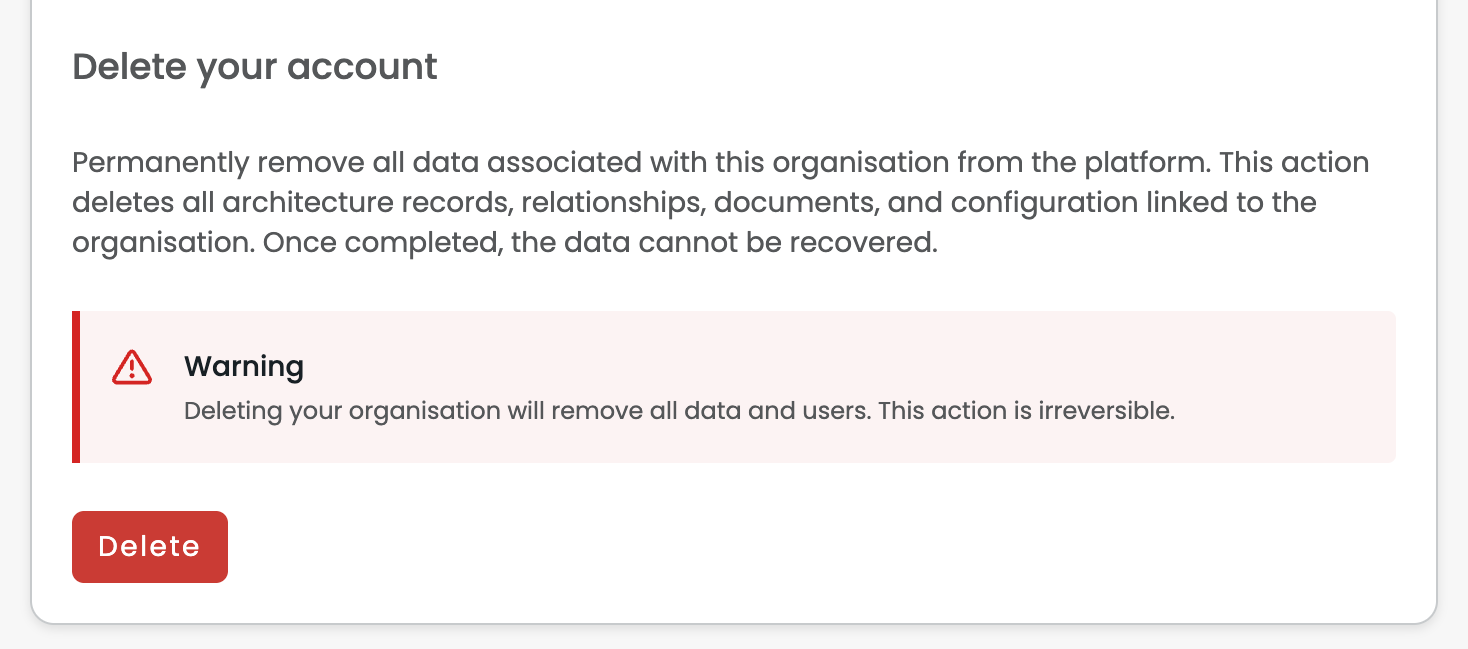 Deleting your account permanently removes your organisation and all associated data from Colloquial. This includes all Fact Cards, relationships, views, templates, and configuration. This action cannot be undone.