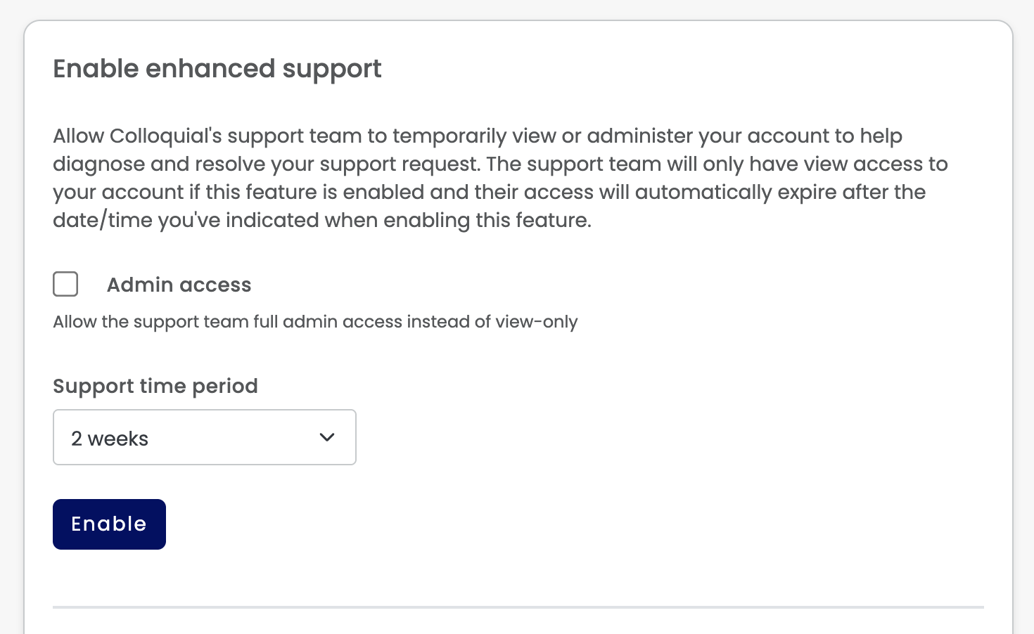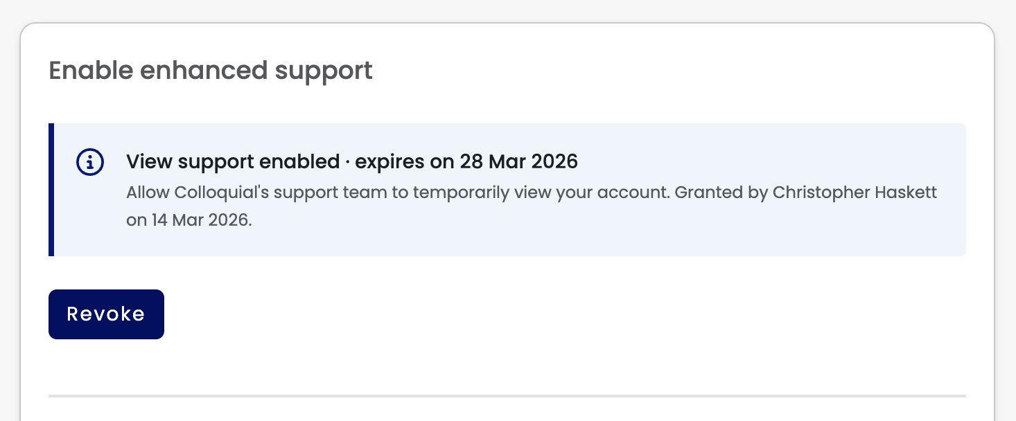 Enhanced support access lets you grant Colloquial's support team temporary access to your account so they can help diagnose and resolve a support request faster — without you needing to share credentials.